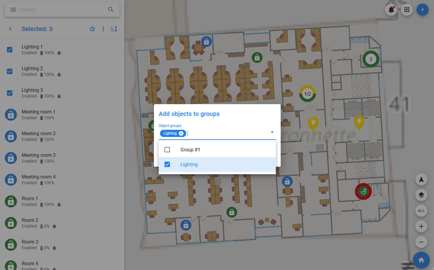 In PixelMonitor, there is such a thing as groups of objects: groups are displayed in the menu and when you select a group in the list and on the map, only those objects that are part of it are displayed. Also, a plan can be linked to the group, then it will be displayed when you select the group.