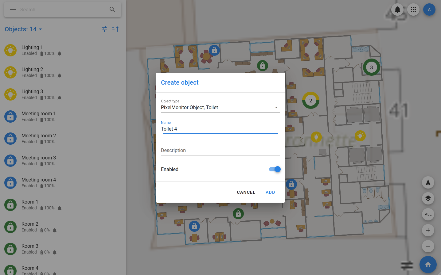 - Click ADD: If the object is successfully created, its card will open, and the object itself will appear in the center of the map.