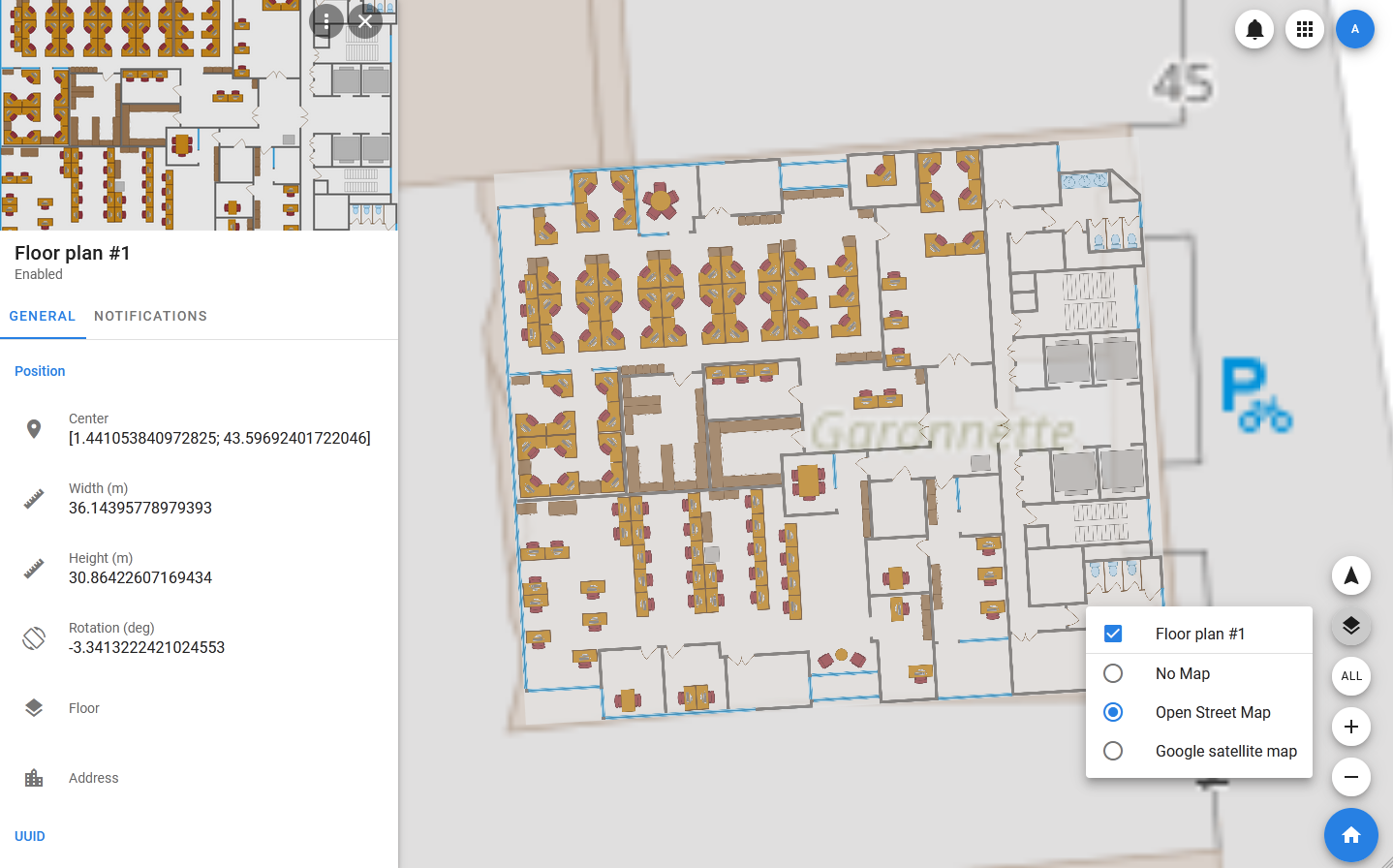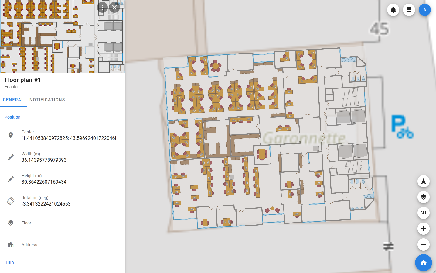 The loaded plan can be scaled with the same proportions and rotated in visual mode: this allows you to position it on the map so that the position of the plan corresponds to the actual position of the objects.